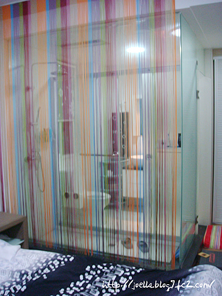 然后把之前搞的彩虹帘挂在了透明浴室外面